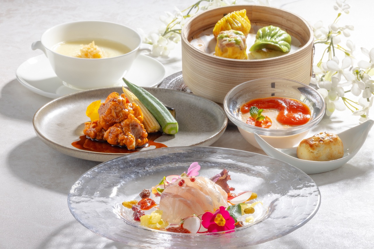 エディブルフラワーを添えたサラダや翡翠色が美しい餃子など、彩り豊かなお料理をご用意しました。地元食材「