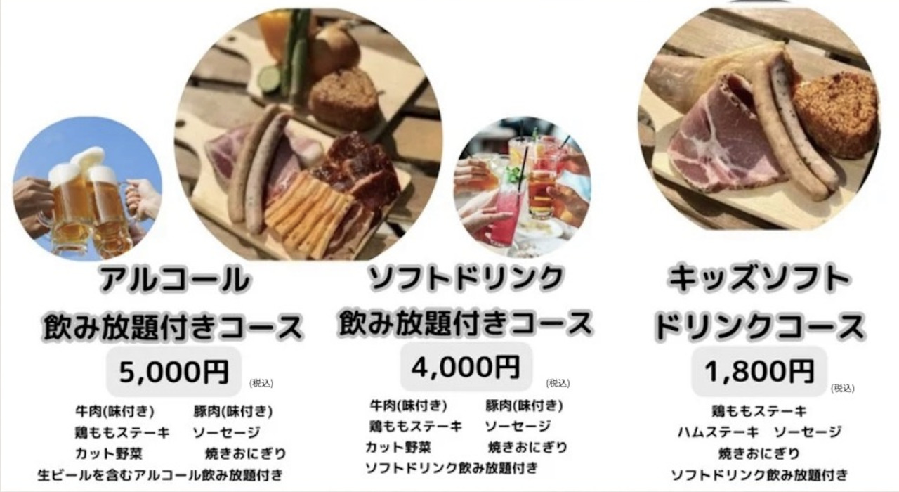 ・BBQ利用料、飲料は含みませんので、別途ご注文下さい。