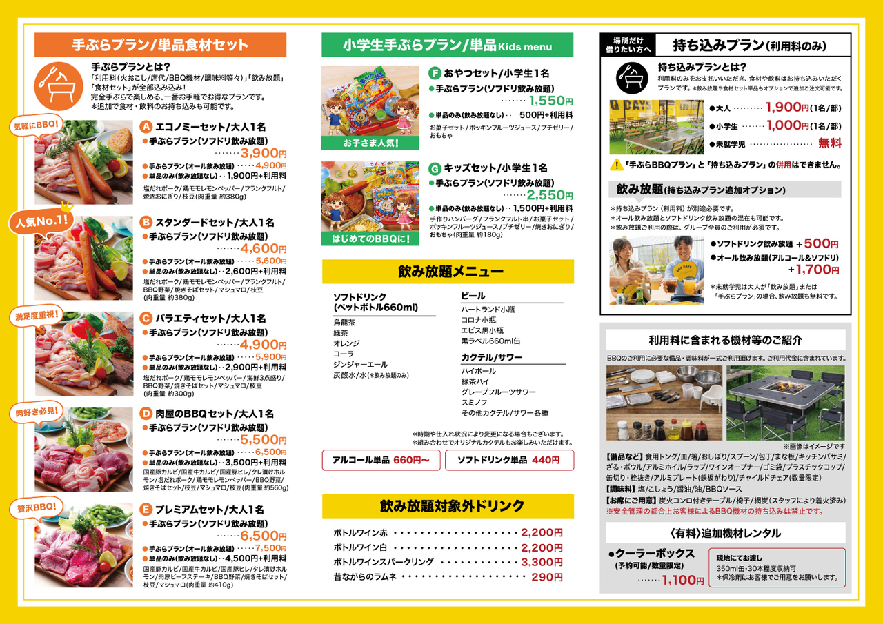 🔴ご利用には「手ぶらBBQプラン」または「持ち込みプラン」のいずれかを、小学生以上のお客様全員分ご選択ください。