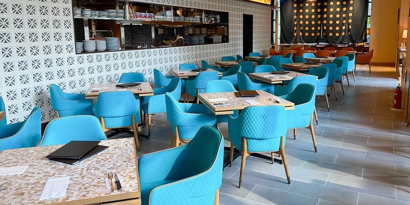 店内は天井が4Mと高く開放的なうえ、しっかりとした換気も行っております。またご注文はタッチパネルメニューで完結。屋外テラス席もございますので、ご希望の方はお気軽にお申し付けください。
