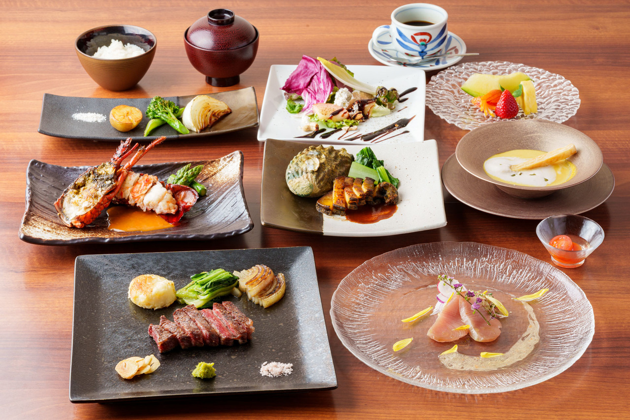 前菜/季節のスープ/アワビの鉄板焼き又はフォアグラ鉄板焼き/知喜多特製サラダ/伊勢海老鉄板焼き/口直し/黒毛和牛ステーキ(フィレ80g又はサーロイン100g)/焼き野菜/