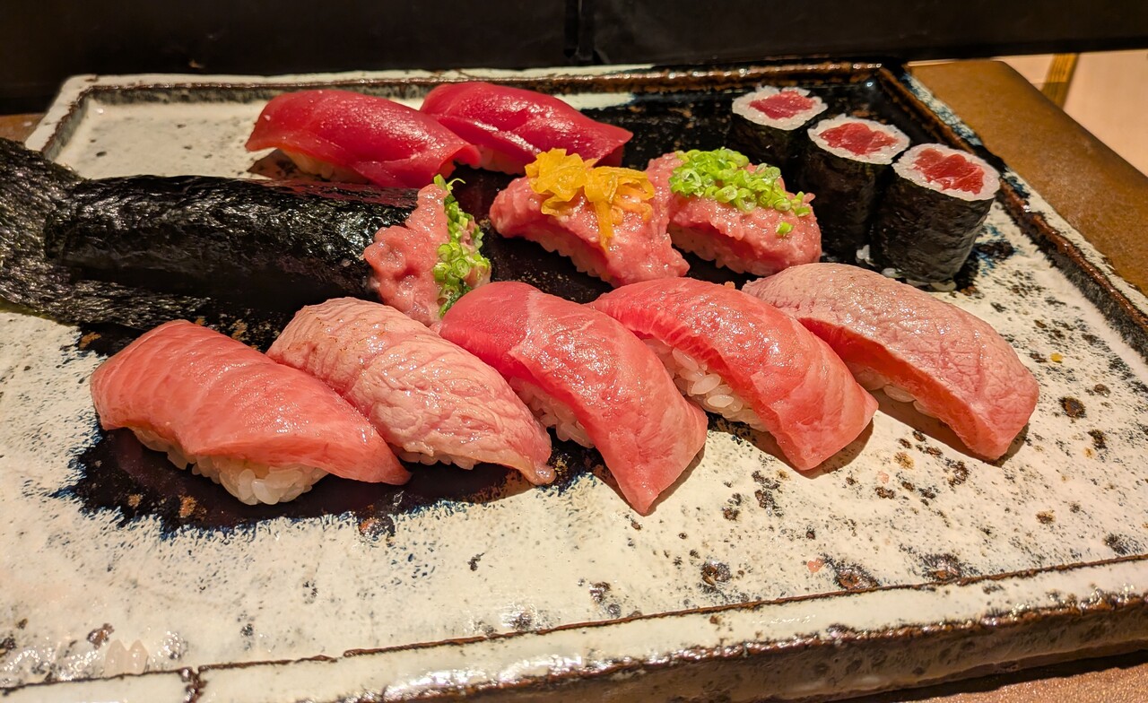 Fatty tuna (otoro), medium fatty tuna (chutoro), lean tuna (akami), fatty tuna and sea urchin hand roll, seared Saga beef ribeye, salmon, conger eel, white fish, daily special seared fish, shrimp, cucumber roll