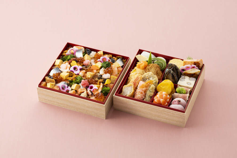 ひなまつり二段重:職人の繊細な技で一品一品を丁寧に仕上げた、和食八寸とちらし寿司。彩り豊かな味わいをお愉しみください。
