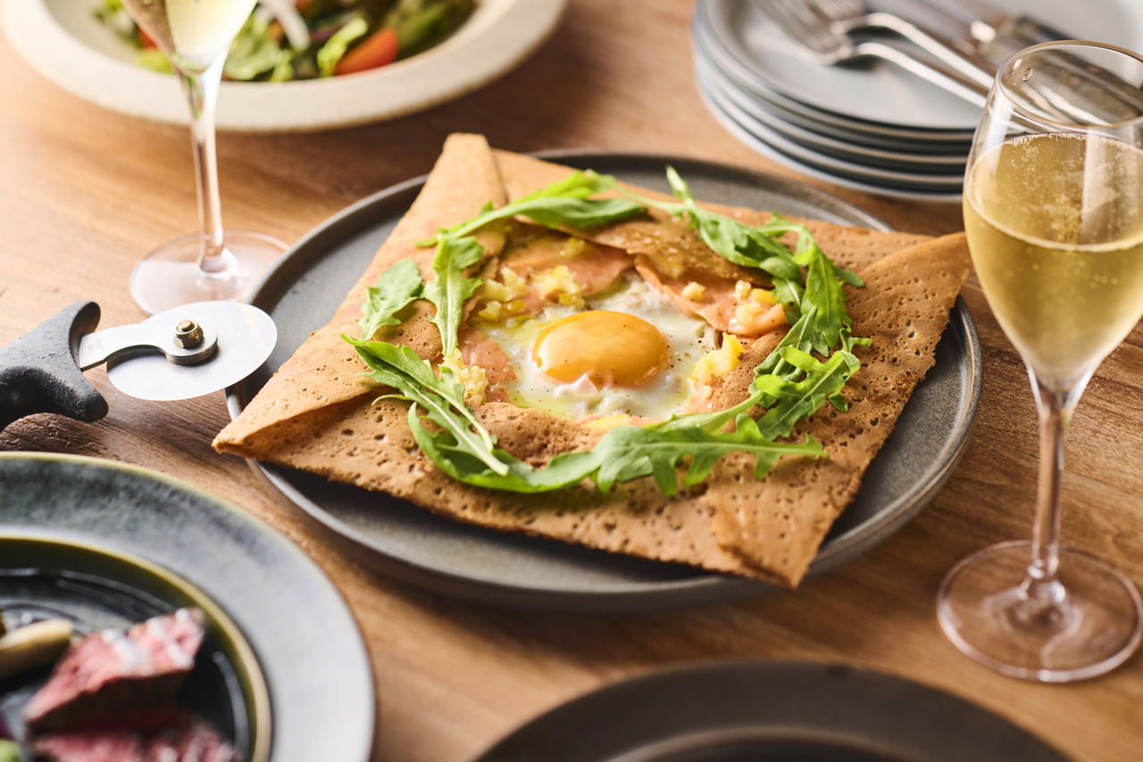 A special lunch-only course featuring Hearth's galette, A5-grade domestic Wagyu beef, and a glass of sparkling wine for a toast.