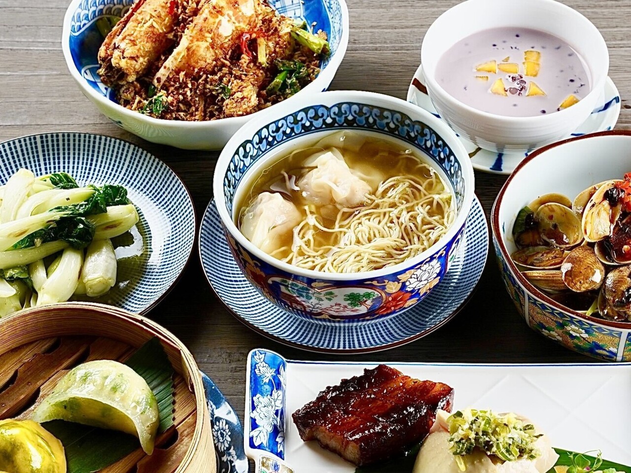 店内で毎日仕込む「2種蒸し点心」、甘辛いオリジナルのレモンソースが食欲をそそる「香港レモンチキン」、喜記のランチ一番人気メニューでプリプリのワンタンと弾力有る細麺が自慢の「海老ワンタン麺」、鮑やトリュフに和牛も入った「鮑とトリュフと和牛の黒胡椒パイ」、デザートは香港スイーツの定番となる「エッグタルト」、皆で楽しむ「薬膳茶」も含めた全8品。