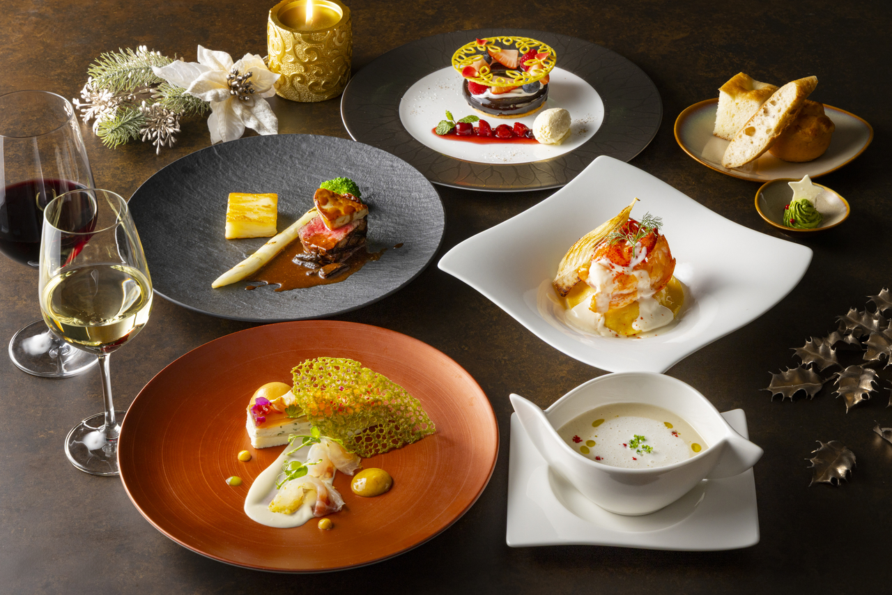 For the main course, we offer "Foie Gras and Domestic Beef Tenderloin Rossini Style," which is a thickly sliced grilled domestic beef fillet topped with a generous layer of sautéed foie gras and finished with a rich truffle sauce. Enjoy this dish, perfect for spending Christmas with your loved ones.