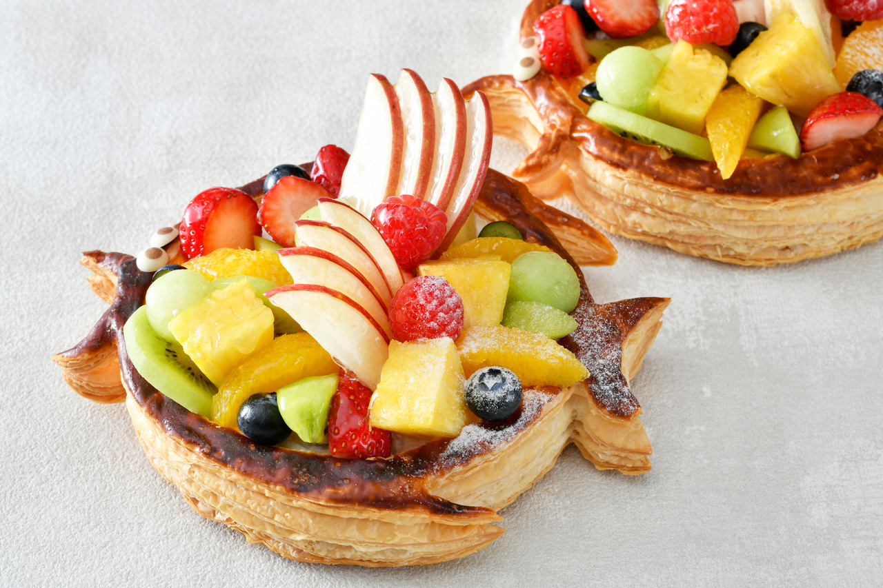 フランスではエイプリルフールの事を『Poisson d'avril(4月の魚)』と呼び、魚をモチーフにしたお菓子を食べて春の訪れを祝うユニークな伝統習慣があります。芳香なバターの香り漂うサクサクのパイ生地にリンゴ、キウイ、オレンジ、メロン等様々なフルーツをふんだんにのせた彩り豊かに仕上げました。優しい甘さのカスタードクリームとフルーツの酸味を絶妙なバランスで仕上げた一品です。