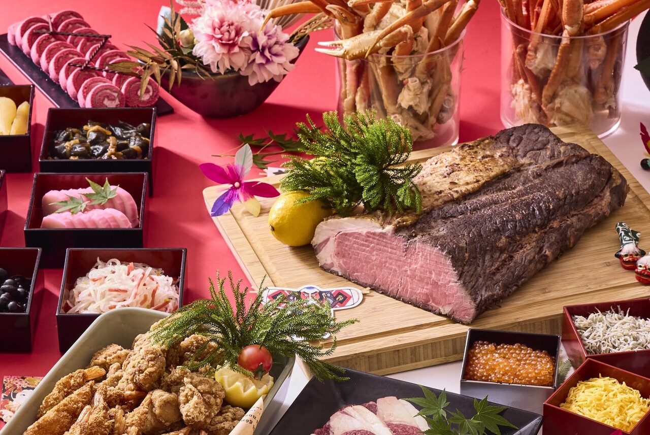 ホテル最大のシャンデリアが輝く広々とした宴会場で、ご家族揃って贅沢なお正月ビュッフェをお楽しみください。おせちや赤飯、国産牛の鉄板焼き、天ぷら、握り寿司、点心など、和洋中の料理が勢ぞろいです。