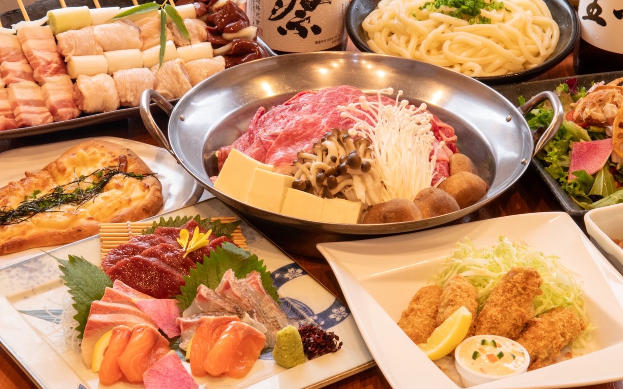 焼鳥、鯛のお造り、和牛のすき焼きの入った贅沢コース