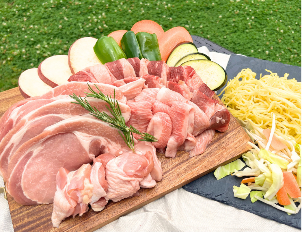 大人:豚ロースステーキ100g、牛バラ80g、豚トロ80g、鶏もも80g、焼きそば(焼きそば用の肉・キャベツ・人参付き)、季節の野菜