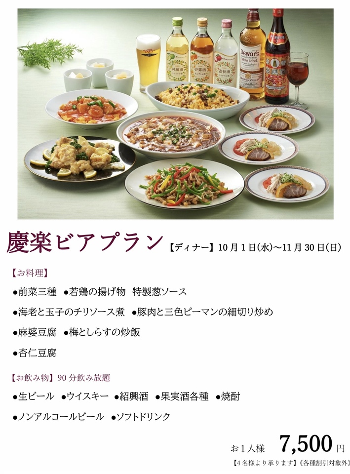 生ビール、ウイスキー、紹興酒、焼酎、果実酒