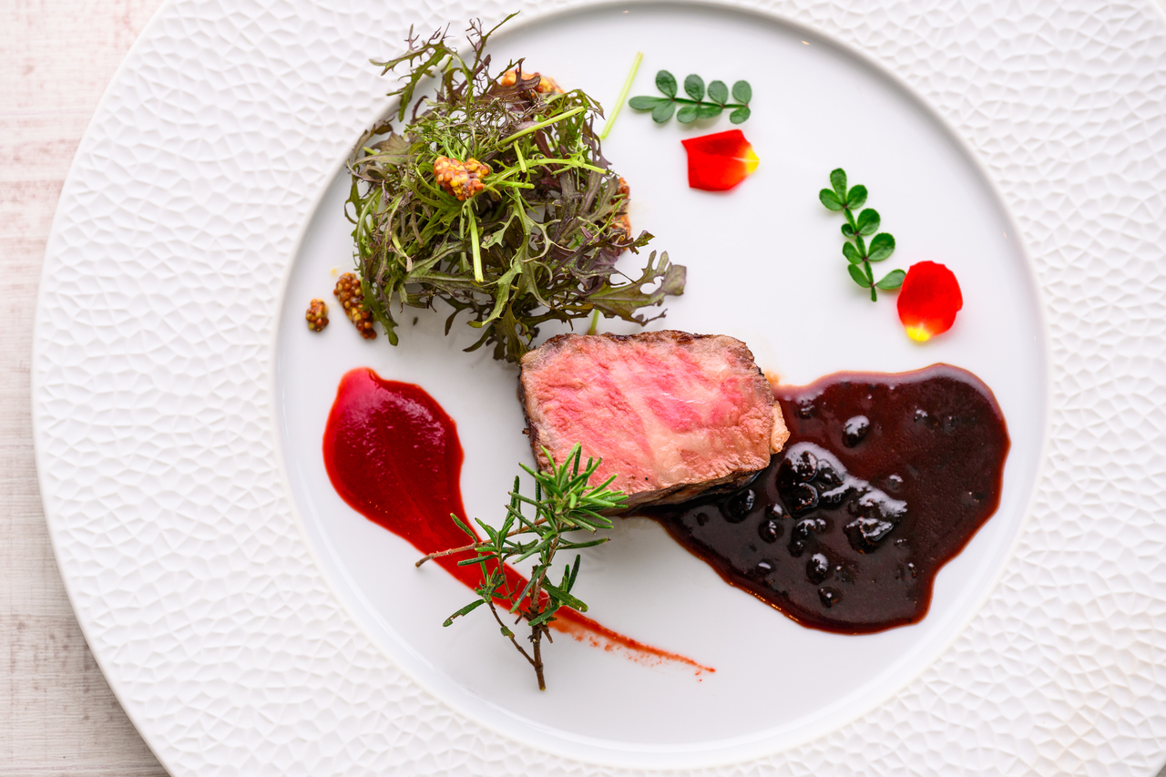 Amuse (hospitality) Seasonal greetings from Kouri IslandHors-d'œuvre (cold appetizer) Local tuna mi-cuit with pesto sauceSoup (soup) Island vegetable potagePain (bread) Two types of hotel breadPoisson (fish dish) Grilled spiny lobster with sea urchin sauceGranité (palate cleanser) Passion fruit graniteViande (meat dish) Wagyu beef sirloin steak with brown sugar and red wine sauceDessert (dessert of the day)