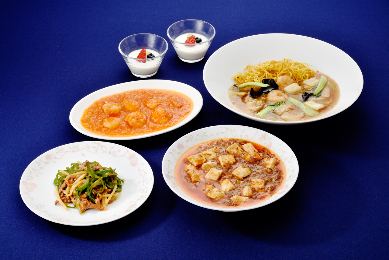 お好きな料理に、 麺料理と麻婆豆腐、デザートなどがついたランチセットです。