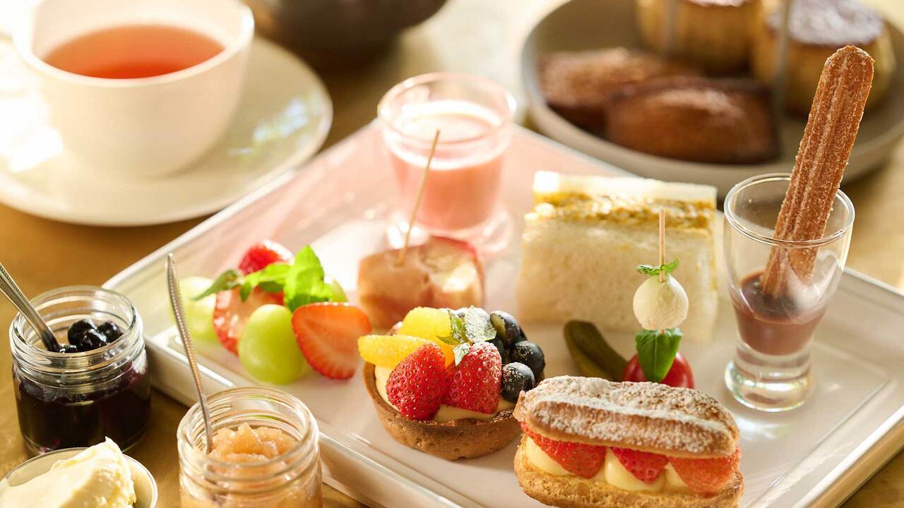 A luxurious menu that includes a plate of fruit tarts, fruit eclairs, egg sandwiches, caprese pintxos, strawberry soup, etc., as well as scones and financiers. Free tea is also included, so you can enjoy a relaxing afternoon.