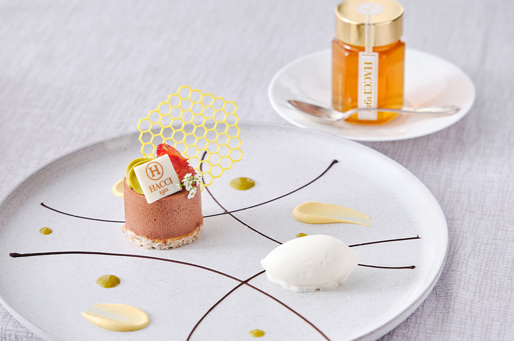 ◆HACCIはちみつ「フラワーブーケ」を使用した ビターショコラのムース 塩ミルクアイス添え