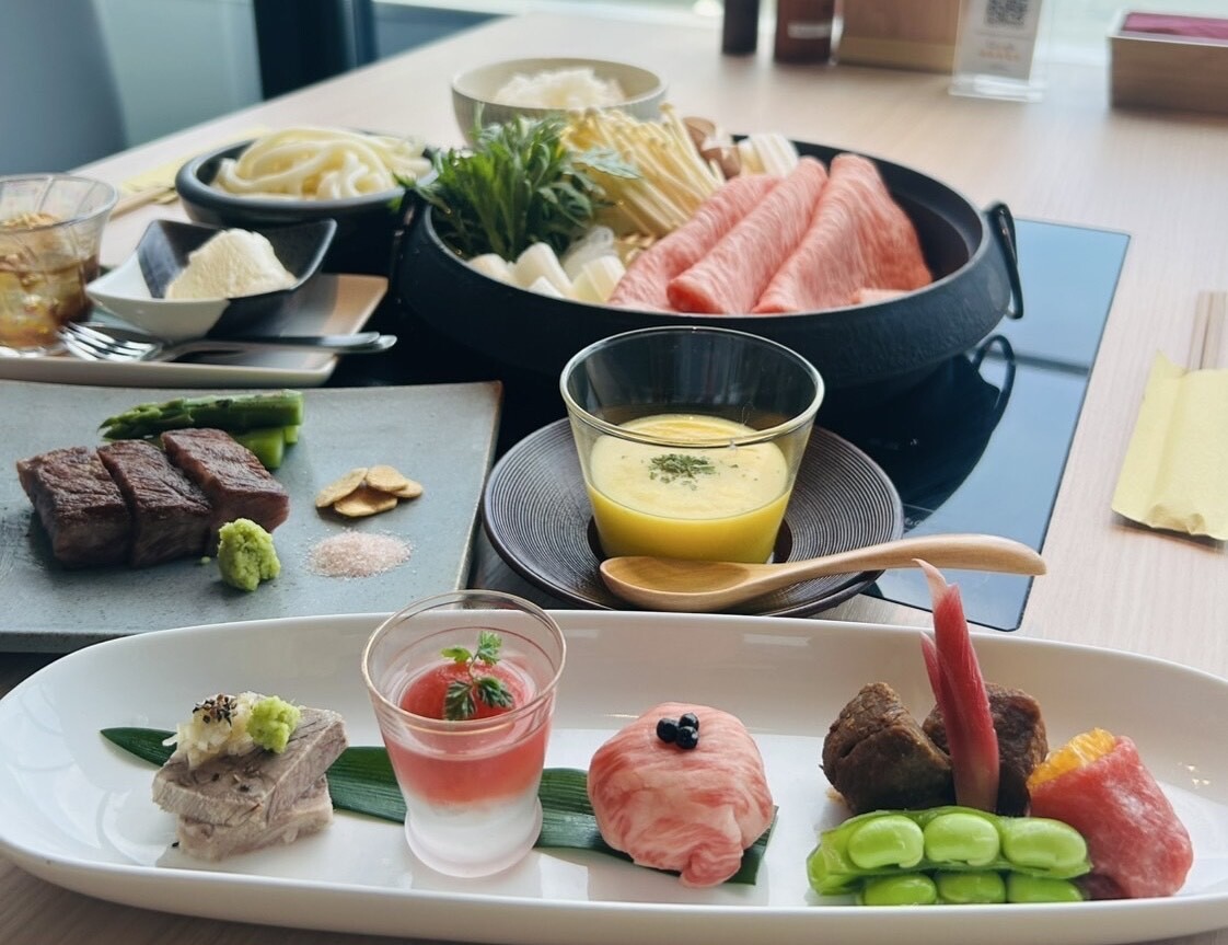 ພວກເຮົານຳສະເຫຼີມສົດອະນຸຣັກການບັນຍາຍກັບ sukiyaki ແລະ steak ຈາກ Wagyu ພຣີເມຍລ໌ ຊັ້ນ A5.