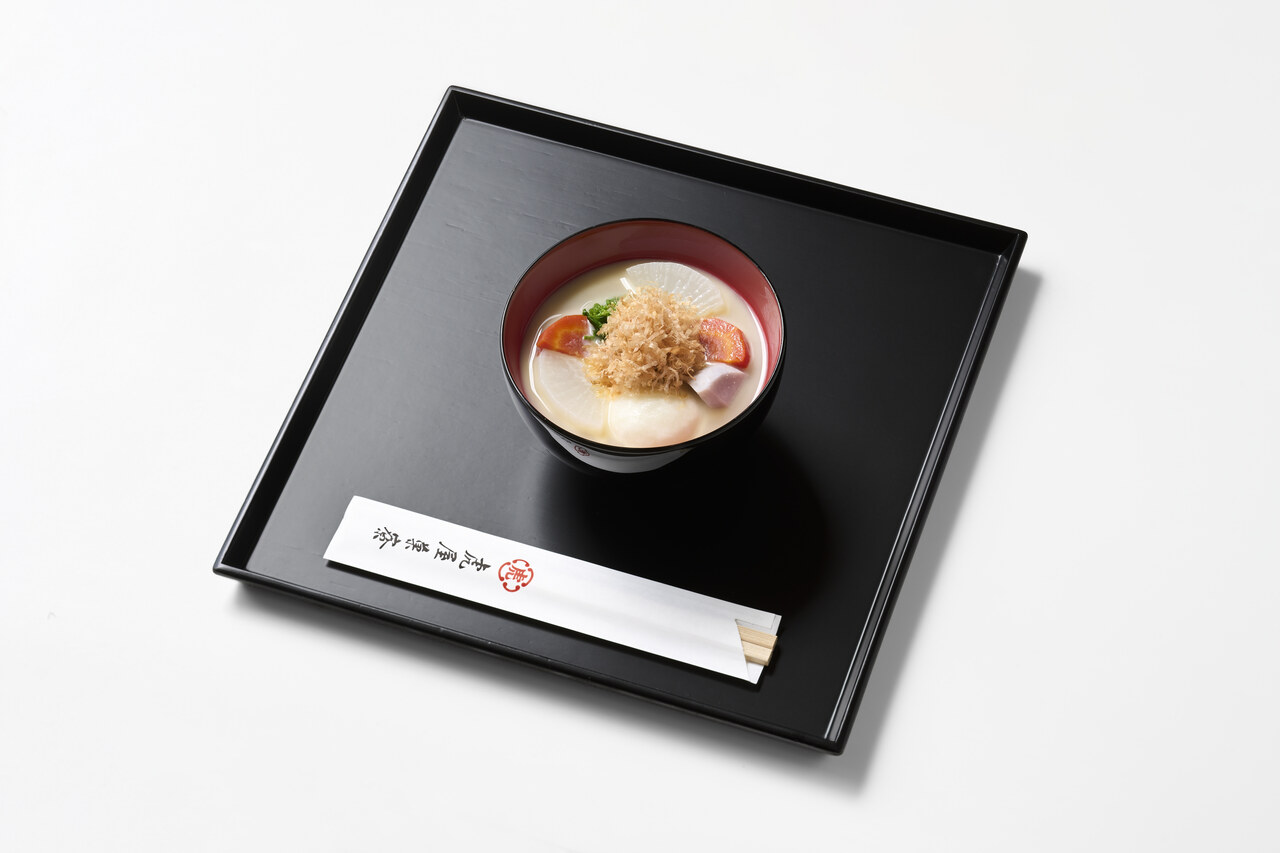 this variety is made with naturally sweet miso and contains round mochi and vegetables.