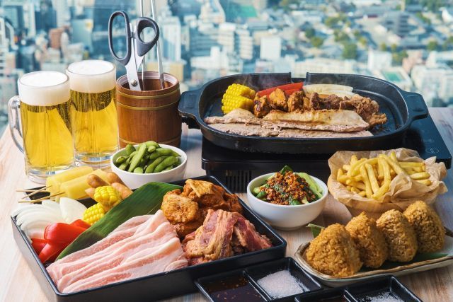 The door of the café opens to a spacious garden in the sky. Take in the panoramic view of Osaka from Japan's highest observation deck while enjoying a romantic dinner under the sky. Offered are loco moco, omurice (omelete rice), and other café menus as well as finger foods to snack on as you sip a drink. Larger groups can enjoy the BBQ plan.