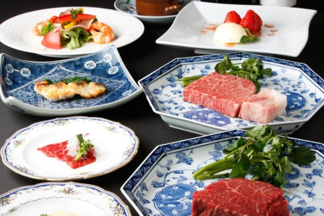 前菜/本日のスープ/アワビの鉄板焼き又はフォアグラ鉄板焼き/知喜多特製サラダ/伊勢海老鉄板焼き/口直し/黒毛和牛ステーキ(フィレ80g又はサーロイン100g)/焼き野菜/御飯・味噌汁・香の物/デザート・コーヒー