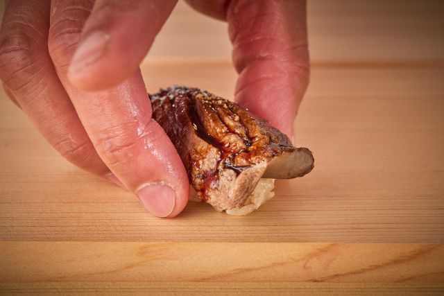 At "Beef Sushi Kintan," you can enjoy beef sushi made with more than 20 different cuts, as well as the specialty sea urchin hotdog. In a refined space decorated with white wood and gold, you can fully enjoy exquisite cuisine that stimulates all five senses.