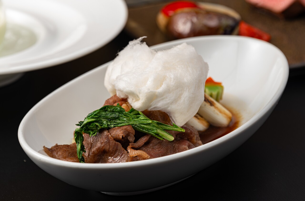 鉄板焼き なにわのコースは、自家製割り下で仕上げた和牛の「大阪ウメビーフの鉄板SUKIYAKI」から始まります。