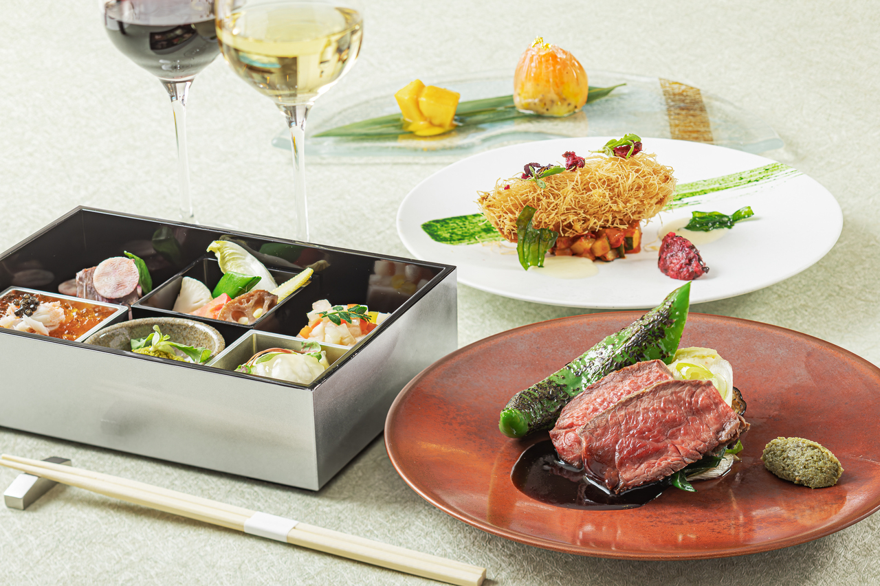[Toasting drink] Sakura cocktail (can be changed to non-alcoholic) [Amuse-bouche] A piece of hospitality, Yatsuhashi and foie gras, two types of preparation [Western-style hassun to color the four seasons] ・Conger eel escabeche ・Foie gras and mango monaka ・Pork and red miso pate with beetroot and port wine sauce ・Vegetable bagna cauda ・Swordfish confit with summer vegetables and tomato sauce ・Vegetable mousse and consommé jelly with caviar [Meat dish] Roasted Kyoto duck with manganji pepper and duck jus [Dessert] Citrus kingyokukan with seasonal fruits [Bread] [After-meal drink] *The menu may change depending on the availability of ingredients.