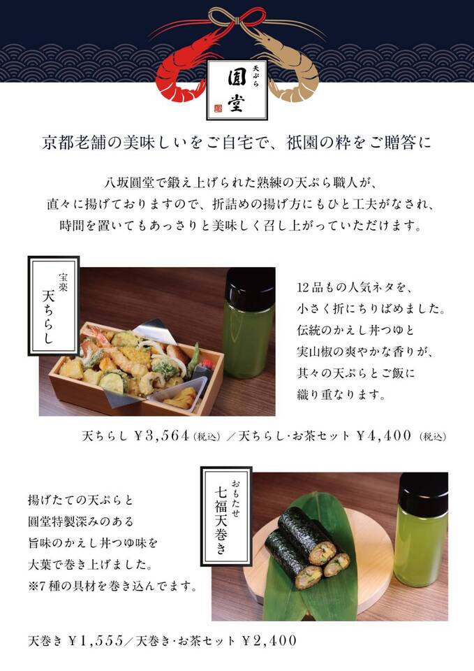 京都老舗の美味しいをご自宅で。7種の具材を織り込んだワンハンドの天巻き。圓堂オリジナルボトルに入った祇園辻利のお茶をご一緒に。