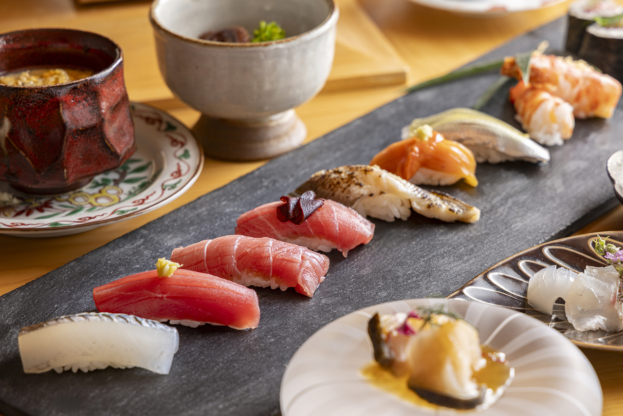 すし絵馬特製珍味小鉢に加え、まぐろ大トロや、煮穴子、手巻き寿司を含む全11品を用意したすし絵馬定番のディナ-コース