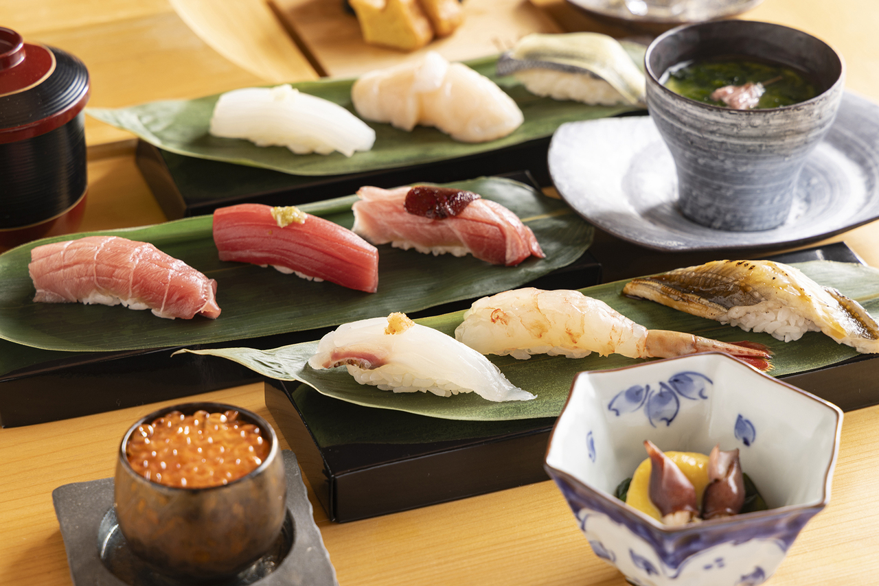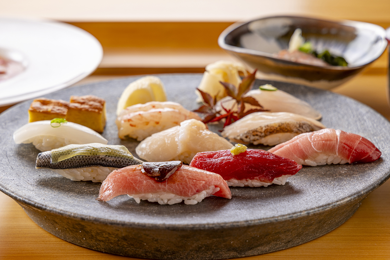 まぐろ大トロ、まぐろ中トロ、まぐろ赤身、煮穴子、旬の貝、だし醤油漬けいくら小鉢、などを含む全10貫
