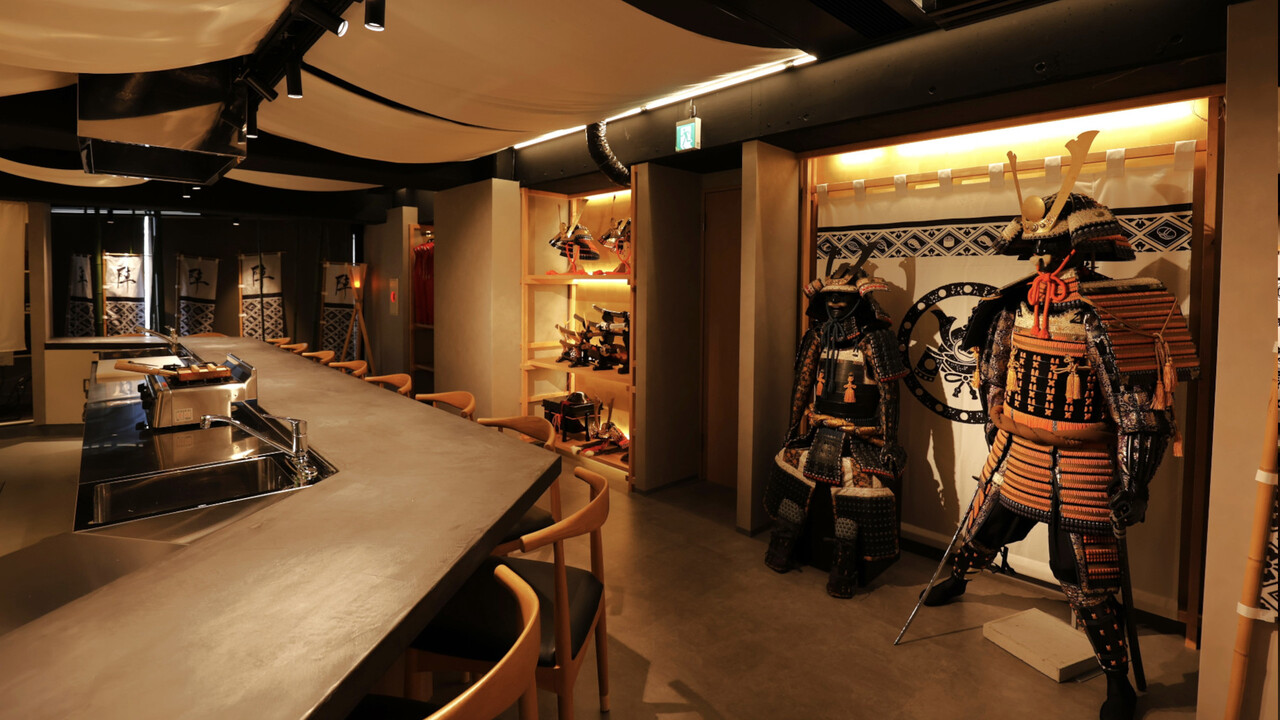 Inside, you'll find armor, helmets, Japanese swords, battle curtains, battle flags, and bonfires, creating a stunning space recreating the world of the Sengoku period.