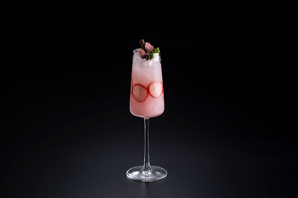 A harmonious spring cocktail combining Osaka-produced sake Katano Sakura, cherry blossom liqueur, and red wine. Gentle sweet-tart strawberry flavors and its cherry-blossom color make this a truly charming glass.