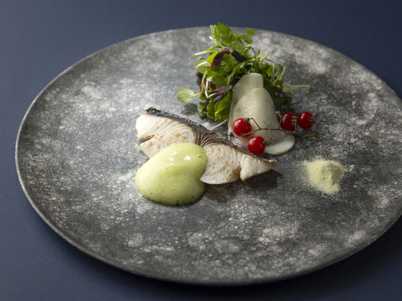 寒鰆の軽い炙り 蕪の葉のソースと蕪のマリネ