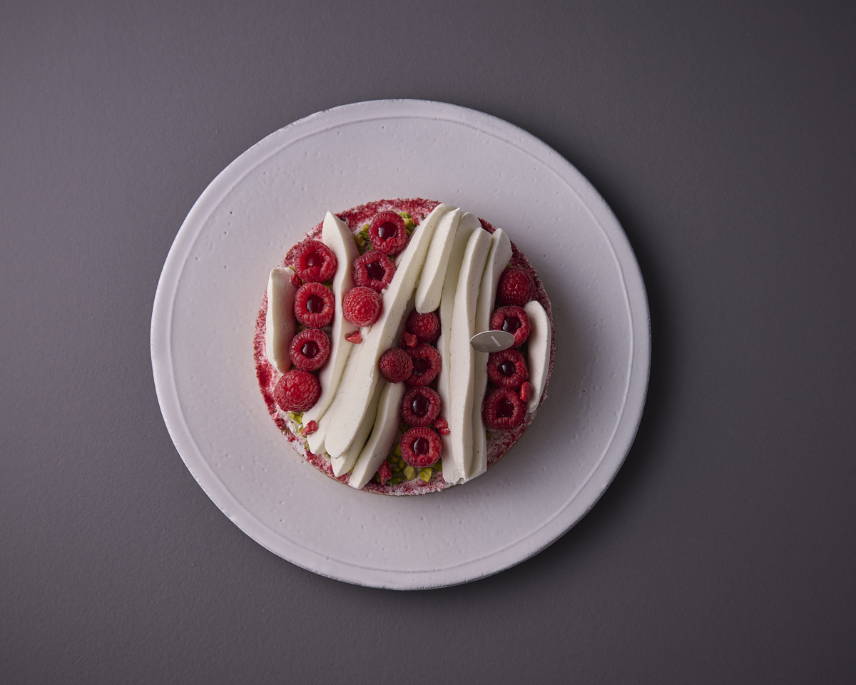 ピスタチオダマンド、フランボワーズコンフィチュールとともに焼き上げたタルト。
