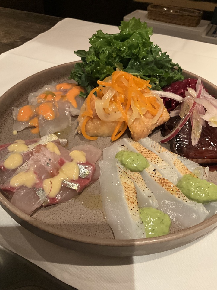 [本日入荷鮮魚と有機野菜の前菜盛り合わせ]