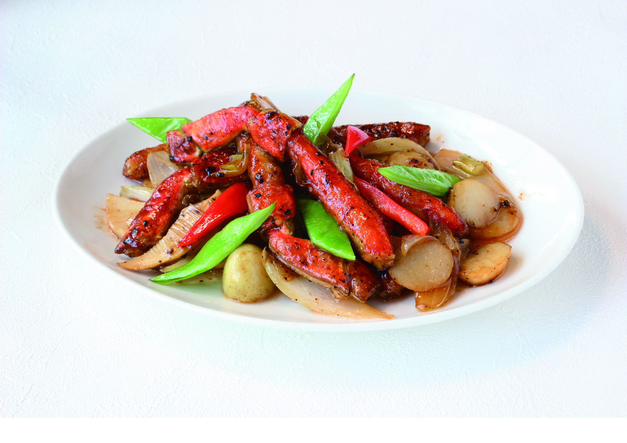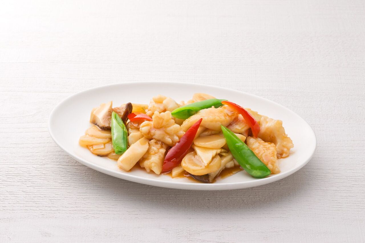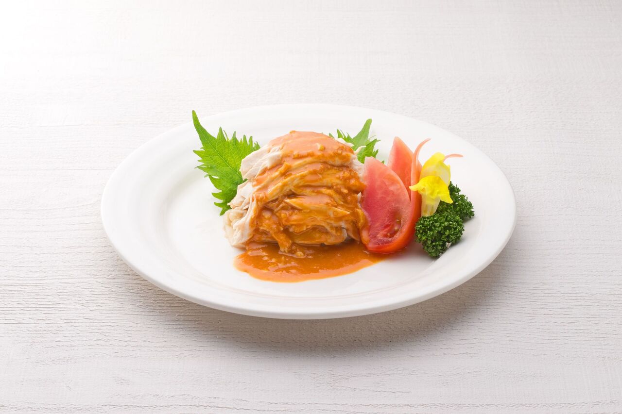 四川省で愛されている鶏肉の炒めを県産地鶏「富嶽白鶏」で仕上げました。芽菜(ヤーツァイ)の独特な味わいをサンチュに包んでお召し上がりください。