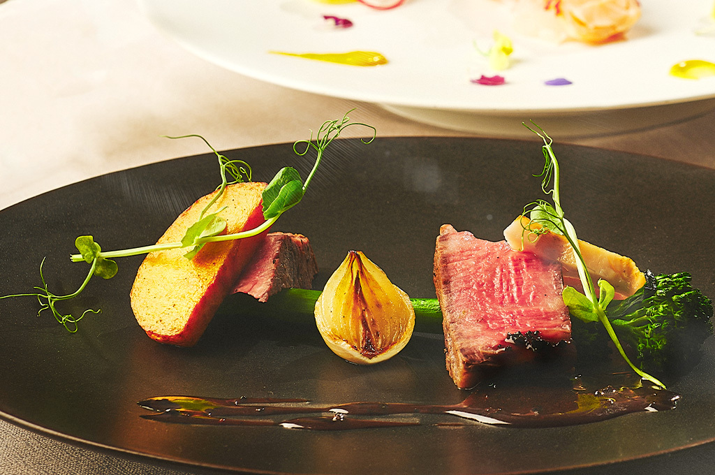 豚フィレ肉のコンフィ ハーブの香り 新人参のピューレとマスタードソース