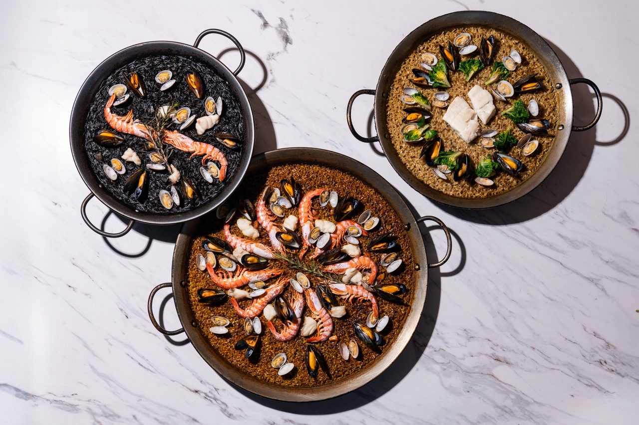 Assorted tapas, salad, patatas bravas, a choice of paella, dessert & cafe.