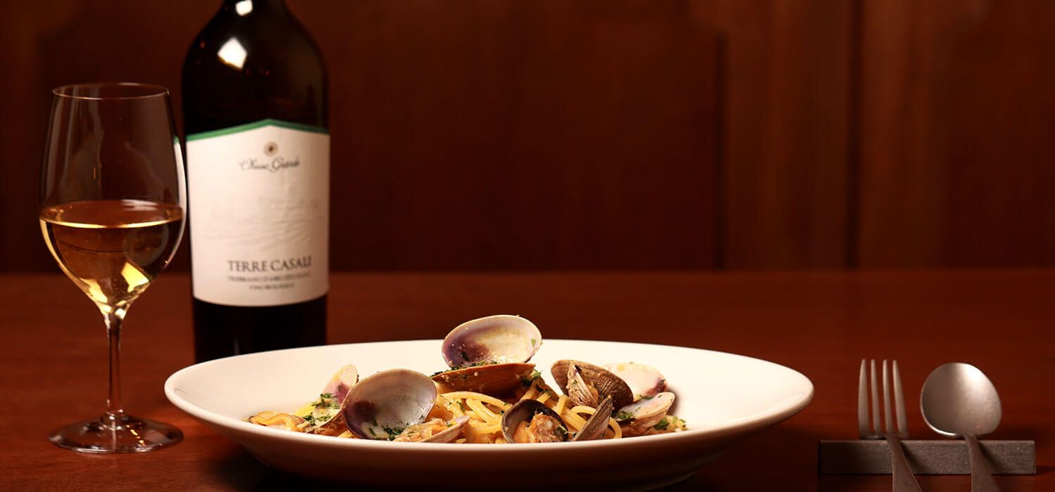 ① Three Seasonal Appetizers ② Akkeshi Clams Steamed in Black Pepper and Wine ③ Hokkaido Pork Belly "Asahikawa Bianco" Porchetta ④ Pizza: Margherita with Hokkaido Mozzarella ⑤ Pasta: Japan's Most Delicious Meat Sauce