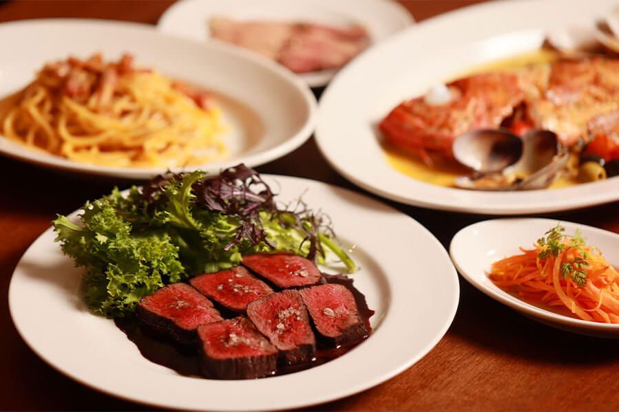 ① 5 Seasonal Appetizers ② Acquapazza Simmered in Hidaka Kelp Stock ③ Roasted Ezo Venison with Red Wine Sauce ④ Quattro Formaggi Pizza ⑤ Pasta with Japan's Most Delicious Meat Sauce ⑥ Assorted Mini Sweets (3 Types) ⑦ Coffee or Tea