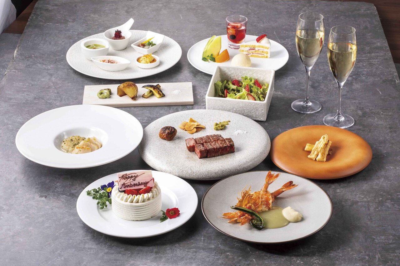 Toast to your anniversary with a glass of champagne! Enjoy a full-course dinner with Kuroge Wagyu beef and angel shrimp teppanyaki as the main course.