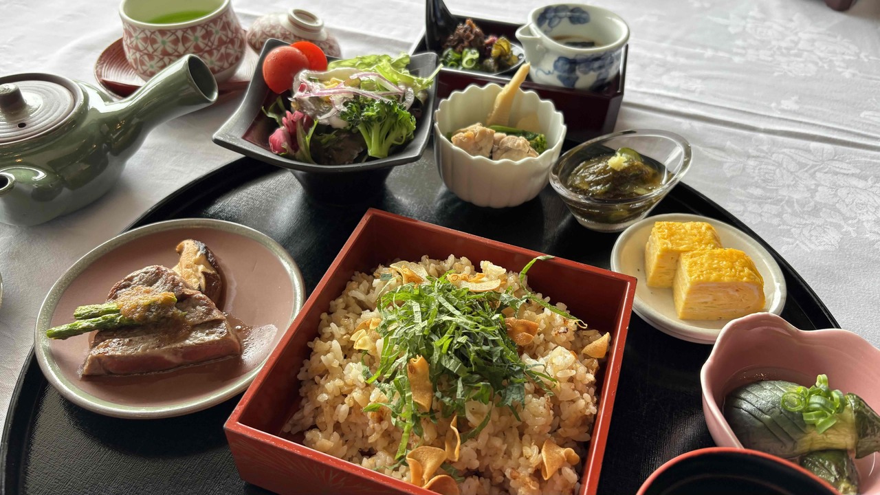Appetizer, soup, salad, carefully selected steak, garlic rice, miso soup, pickles, dessert, coffee