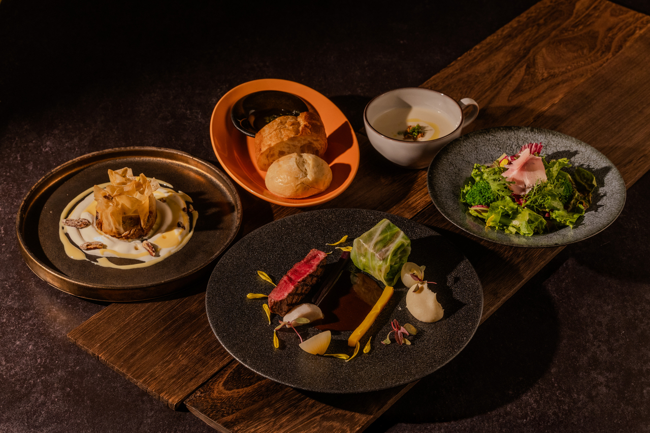 椎茸の旨みが溢れ出す京都ぽーくのローストや、異なる部位を異なる調理スタイルで仕上げた北海道産牛フィレのグリルと牛ホホ肉のキャベツ包みなど4種類のメイン料理からお好きな1品をお選びください。グリーンサラダ&スープ&パン、本日のデザート付。メイン料理は、追加料金500円でステーキフリットを、追加料金1000円で黒毛和牛のグリルに変更できます。