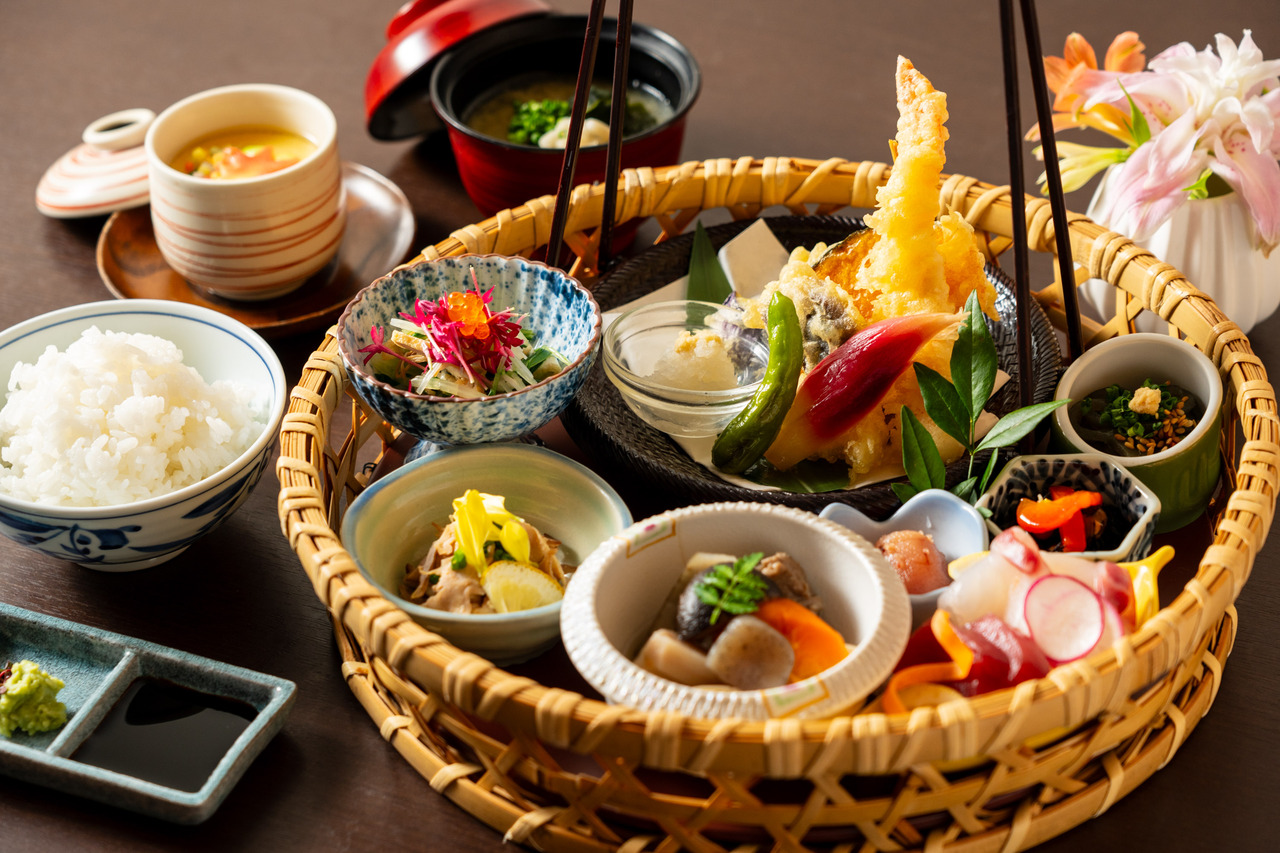【花 籠】 天婦羅、がめ煮、季節のお浸し、小鉢、茶碗蒸し