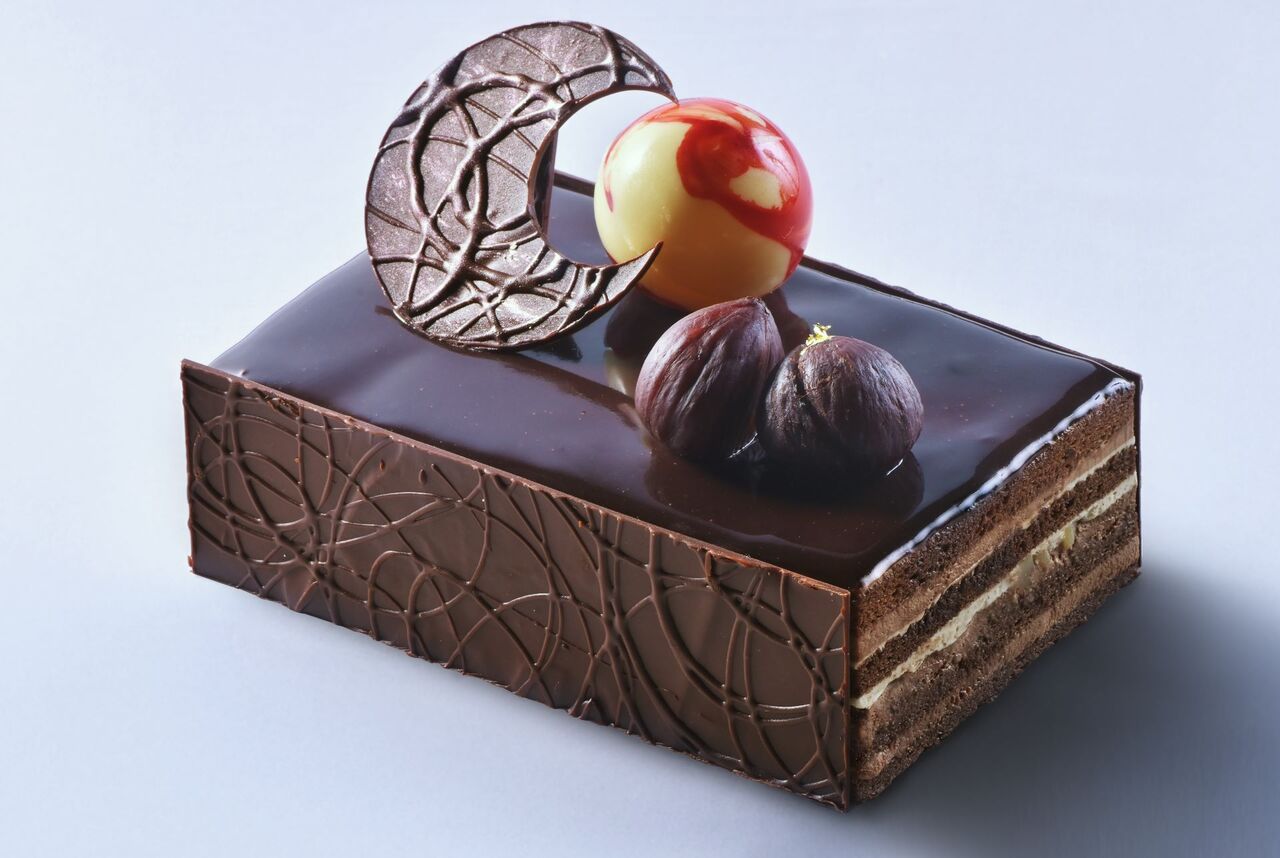 しっとりと焼き上げたショコラ生地と、濃厚なチョコレートクリーム、ふんわり香るマロンクリームの妙なるハーモニーに、刻んだ黄栗がアクセントを添える、上質なスイーツ。つややかなチョコレートのコーティングに映る月の太陽は、大切な人と過ごすホリデーシーズンを、さらに印象的な時間にいたします。