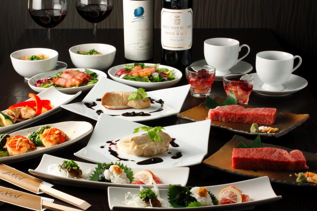 【MENU】 Christmas hors d'oeuvre ~ red and green dichroic sauce ~ ~ marinated champagne julé of Hiroshima oyster and caviar, served with foie gras terrine and root celery mousse snow crab and salmon tartar tomato falci, holo holo chicken putty campagne ~ Special sweet salad of Japanese wagy Tataki Assorted vegetables with soft shell shrimp and gratin of red sea bream French foie gras and raw ham Kaedai winding ~ Hiroshima lemon-flavored balsamico sauce ~ Special black rose wagyu beef loam & peach steak ~ red wine sauce ~ JAKEN original garlic rice (With red juice) Christmas dessert ~ Roll cake of strawberries and green tea, Gelato of coffee