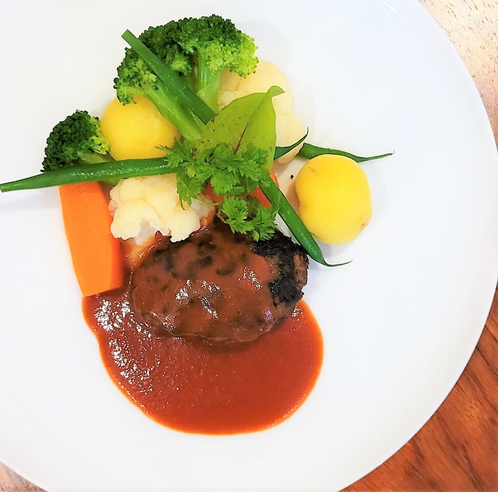 [24th] Butternut squash potage, marinated squid and shrimp, pan-fried fresh fish, braised winter melon, okrabitok (hamburger steak) and steamed vegetable snacks, Aiascheche