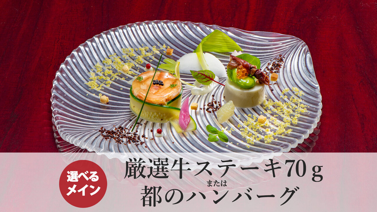 旬のお魚と選べるメイン肉料理(都厳選牛又は都プレミアムハンバーグ)を楽しめます。