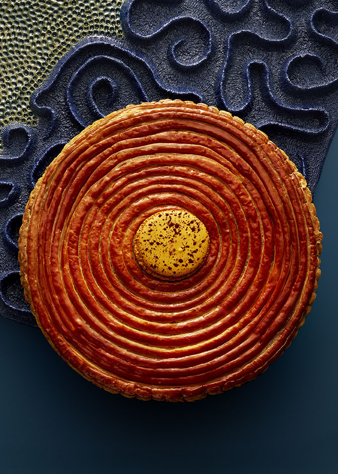 One of Pierre Hermé's signature creations, Mogador, has been specially adapted for this Galette des Rois. Passion fruit notes melt into the almond cream, while fruity ganache and caramelized roasted pineapple create a sweet and tangy flavor. One bite of this crispy treat will send you into ecstasy.