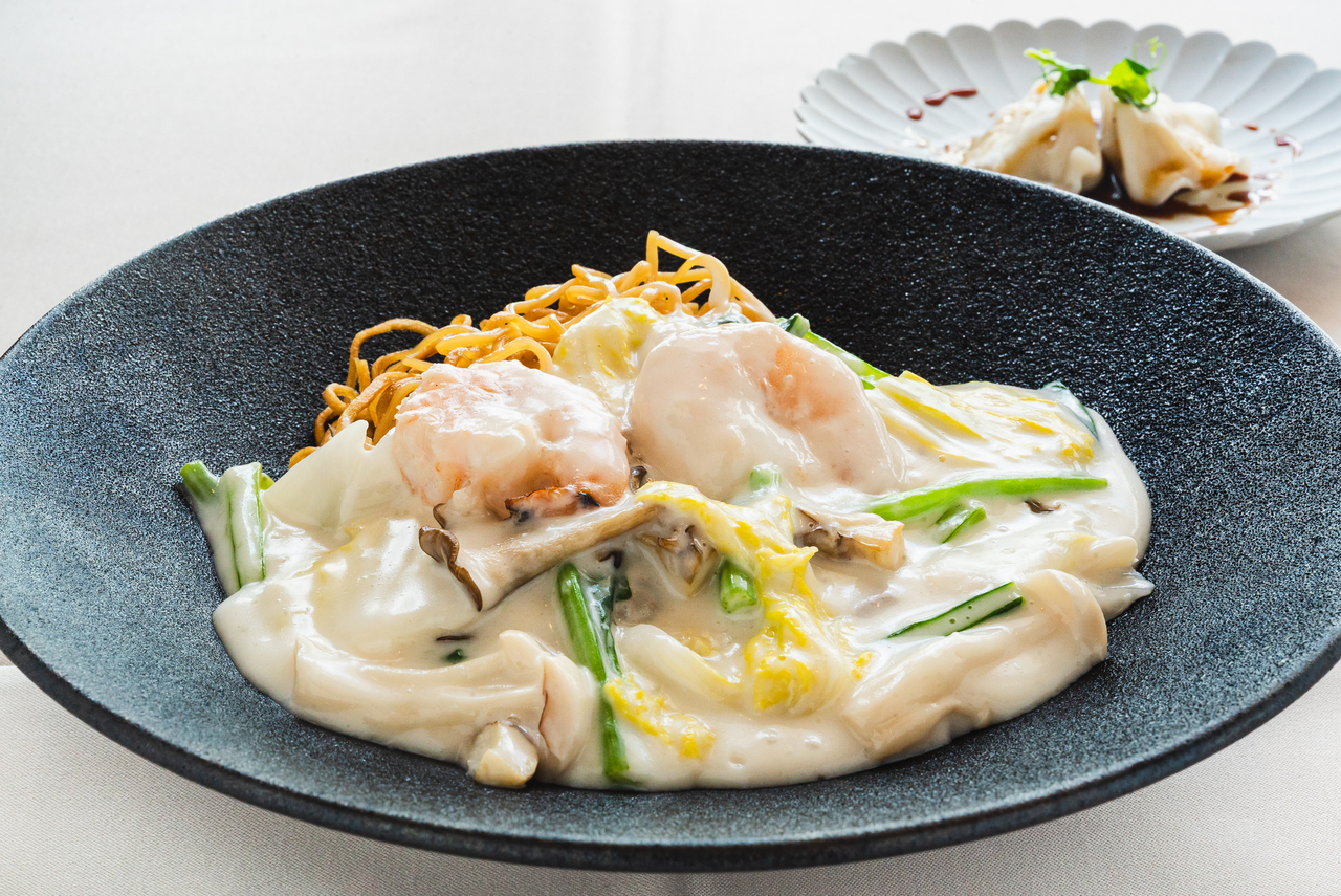 香ばしい麺に絡めた贅沢な一皿。うれしい点心付きでご提供します。