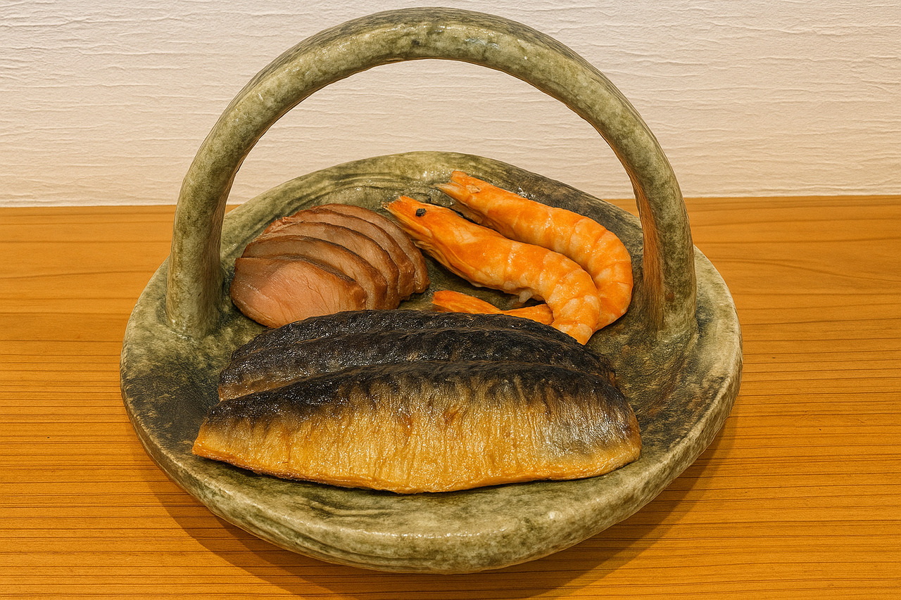 1 piece of duck loin, 3 pieces of boiled herring, 4 pieces of shrimp marinated in Saikyo miso